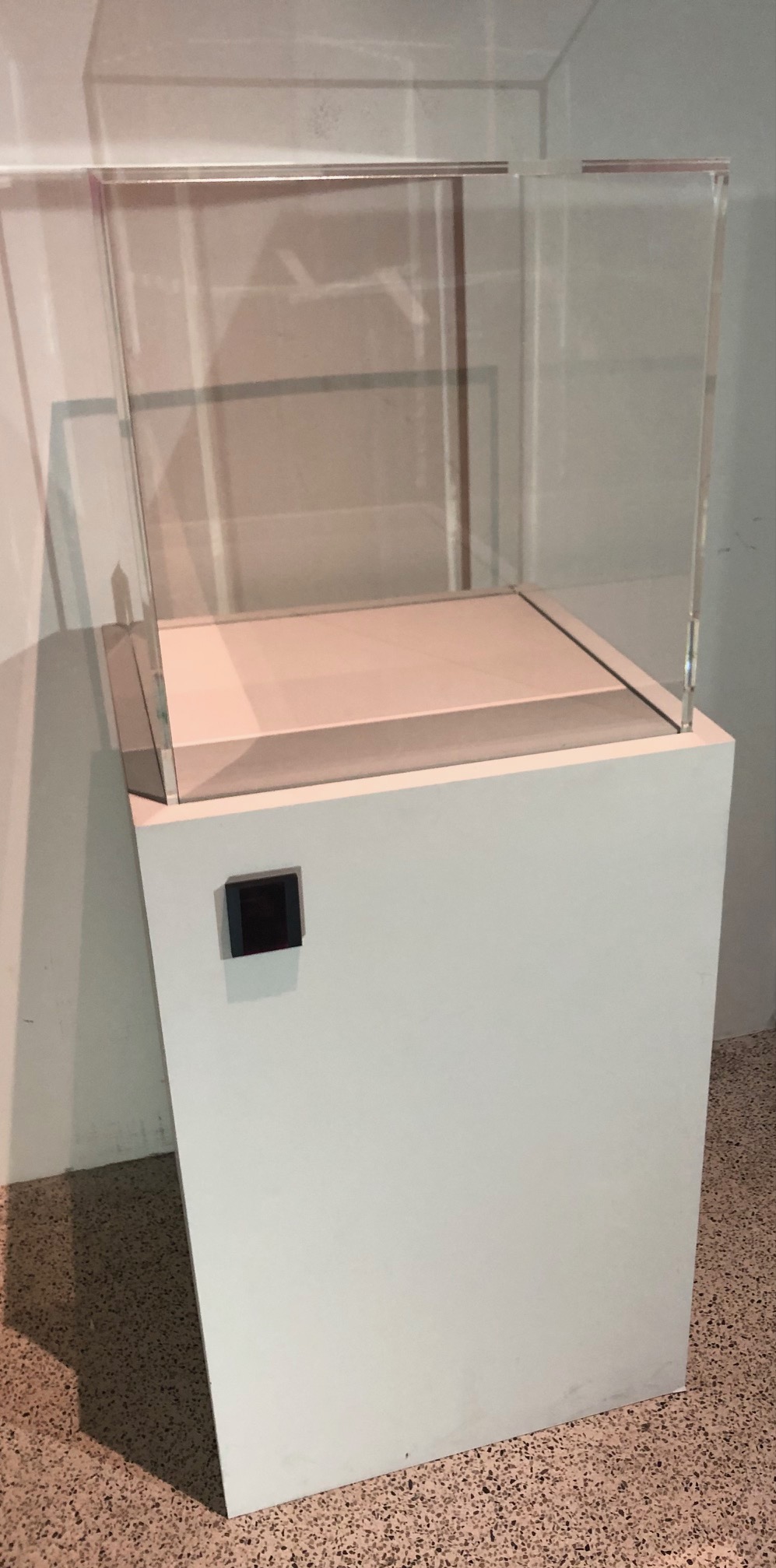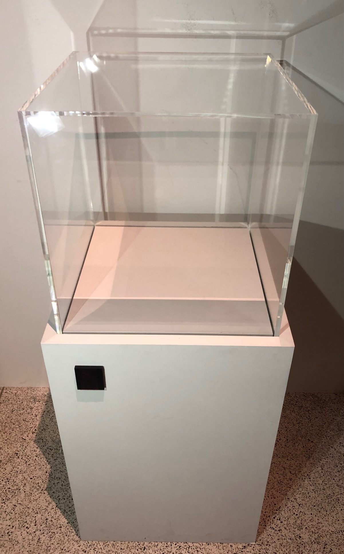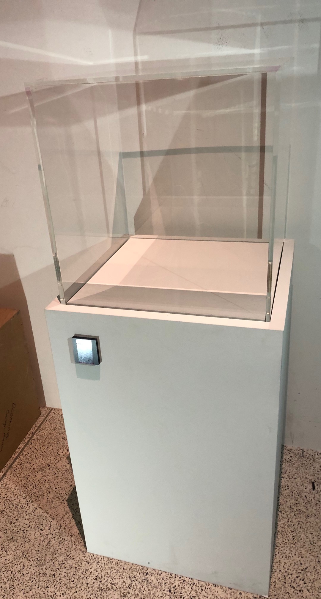 1x plinth with hood. Plinth: 105cm x 67.5cm x 67.5cm. Hood: 60cm x 60cm x 60cm