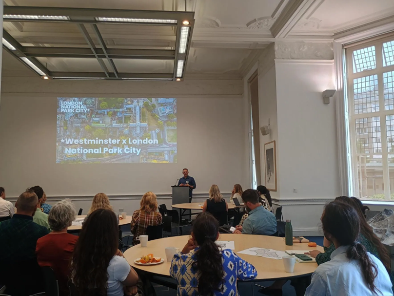 National Park City doing a presentation at the 2nd Wilder Westminster Meeting held at the Royal Geographical Society in July 2025.