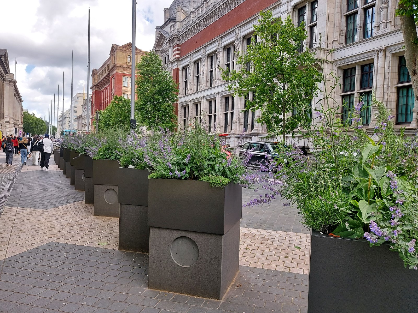 In April 2024, RBKC installed a row of 10 new planters on top of the existing Hostile Vehicle Mitigation (HVM) blocks at the southern end of Exhibition Road. This pilot scheme is a result of an NCIL application that ERCG submitted to the council in 2022 for urban greening.